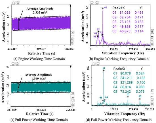 The difference in the frequency domain between the two conditions can be observed after fast Fourier transformation (FFT). The main frequency is 81.055 Hz, and the amplitude is about 0.451 m/s2 when only the engine is working. This is the signal component of the engine to the frame. The main frequency is 80.078 Hz, and the amplitude is 0.524 m/s2 when working at full power. Although the main frequency is very close, there are new signals superimposed under full power operation.