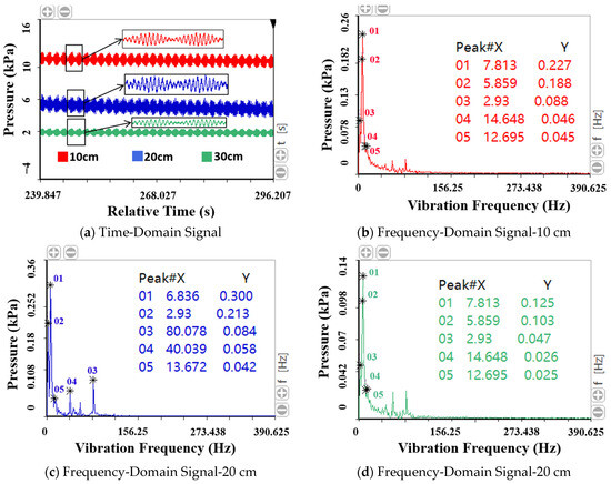 Based on the buried position of the sensor, the time-domain pressure values of measuring points 1, 2, and 3 at a depth of 10 cm to 30 cm are selected for analysis. The combine rests over the pressure sensor in full power mode to compact the soil. The pressure values of these three measurement points under the corresponding working conditions were collected and intercepted, and the signal was changed by Fourier. The obtained time-frequency domain signal is shown in Figure 15.