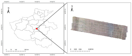 The experimental data were collected at noon in Linying County, Henan Province (23.55 N, 113.59 E), from 25 June to 14 July 2022. Its geographical location is shown in Figure 1. The soybean growth stage during the data collection was between the VC stage (cotyledon stage) and the V2 stage (second trifoliate stage). The UAV image acquisition platform was the DJI Mavic 2 Pro, which has a 20-megapixel camera with a 77° field of view. The resolution of visible light images was 5472 × 3648, with automatic exposure parameters and autofocus mode. During the data acquisition, the flight height of the UAV was 4~10 m, and the flight speed was 1.5 m/s.