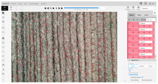 In this paper, the deep learning image annotation tool CVAT (version 2.3.0) was used to manually label the collected UAV visible light image data. The image annotation method was to create an annotation task and then upload the images that needed annotation. Finally, the rectangular box tool was used to select the soybean seedlings in the uploaded image with the mouse to obtain actual boxes for training and testing. The annotation files were saved in the PASCAL VOC data format. Figure 2 shows an example of soybean seedling annotation, where a red rectangular box is used to mark soybean seedlings as “soybean”. The annotation results are saved to the XML format label file.