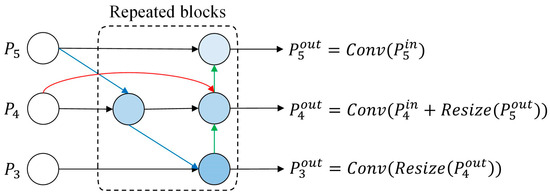 The schematic diagram of the BiFPN module. Among them, the blue and green arrows represent the feature transmission of bidirectional connections between different convolutional layers; the red arrows represent the added skip connections between input and output nodes of the same scale for feature fusion.