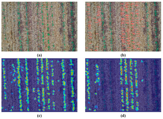 Figure 8a,b show the image of the maize–soybean strip composite planting and the detection image of the M5 model, respectively. The thermal distribution map in Figure 8c shows that the original YOLOv5s model focuses on the soybean seedlings and nearly all of the maize seedlings. Although the model focuses more on the features of soybean seedlings than on maize seedlings, the excessive focus on regions associated with maize seedlings can lead to misclassifications. With the addition of ECA and BiFPN modules, the improved model in Figure 8d emphasizes the focal regions of soybean seedlings and a small number of maize seedlings during the target identification stage. Eventually, soybean seedlings are identified from these focal regions by effectively filtering out the unimportant or non-target feature information, thereby improving identification accuracy.