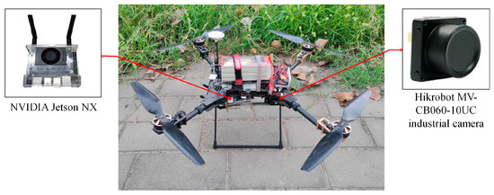 As shown in Figure 9, the proposed model in this study was first deployed on the NVIDIA Jetson NX and then mounted beneath the laboratory-developed UAV. The data acquisition device used in the field experiment was a Hikrobot MV-CB060-10UC industrial camera with a 6-megapixel camera. The maximum resolution was 3072 × 2048, and the maximum frame rate was 60.9 fps. The camera module was connected to the edge device via a USB interface. The UAV battery powered the edge device and the driving motors through a power connection cable. Through testing and analysis, it can be found that the running frame rate of the M4 model proposed in this article on NVIDIA Jetson NX was 34.83 frames/s. Therefore, it can be concluded that the model runs smoothly on low-power edge devices.