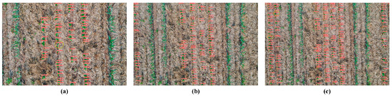 To explore the detection effects of the improved model on soybean images at different flight heights, this field experiment was conducted with fixed-height flights at three levels (3 m, 5 m, and 7 m). The captured soybean image identification results are output from the edge device and displayed in Figure 10.