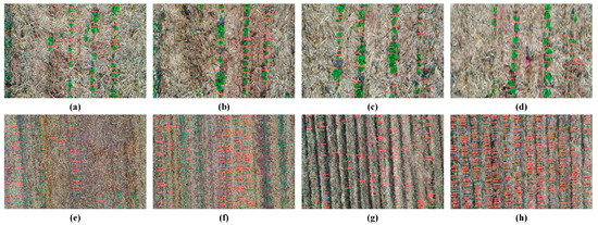 Detection effects of soybean seedlings in different scenarios: (a) 30% jitter; (b) 40% jitter; (c) 50% jitter; (d) 60% jitter; (e) a sparse soybean image; (f) a dense soybean image; (g) the cotyledon stage; (h) the second node stage.