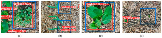 Failure cases detected by the improved model: (a) false detection—Amaranthus; (b) false detection—small maize; (c) missed detection—adhesion; (d) missed detection—undersized soybean seedlings.