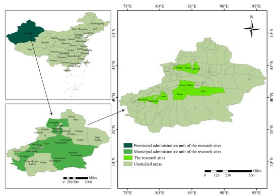 The data in this paper are derived from a special survey of cotton farmers in Xinjiang carried out by the research group from October to December 2022. Xinjiang Province not only ranks first in cotton production in China but also extensively applies many modern agricultural technologies such as cotton breeding, planting, and harvesting. Therefore, it is more representative to choose Xinjiang Province to conduct relevant research on cotton farmers’ adoption of AGPTs. In addition, Xinjiang, as one of the main cotton-producing areas in China, not only has unique natural conditions but also the economic aggregate between different places is not different. Therefore, choosing the two research sites can effectively control the differences in technology adoption caused by natural conditions and economic development. The research was conducted mainly in 10 cities (counties) accounting for more than 4% of the total cotton production in Xinjiang’s major cotton-producing counties: Luntai County, Bachu County, Jinghe County, Gashi County, Yuli County, Awati County, Wusu City, Kuqa County, Shawan City, and Shaya County (shown in Figure 2). Six townships were selected in each city (county) using the random sample method, and nine to ten cotton farmers in the townships (towns) were selected using the random sample method to carry out the field survey again. Ten cotton farmers carried out field surveys (without distinguishing between cotton farmers who joined or did not join the cooperative). A total of 550 paper questionnaires were distributed, and 502 valid questionnaires were returned, achieving a questionnaire effective rate of 91.27%.