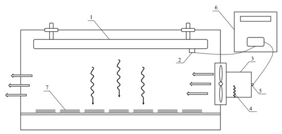 Experimental equipment diagram. 1. Infrared radiation heating plate. 2. Infrared heating plate temperature sensor. 3. Axial fan. 4. Electrical heating wire. 5. Hot air temperature sensor. 6. Computer. 7. Drying materials.