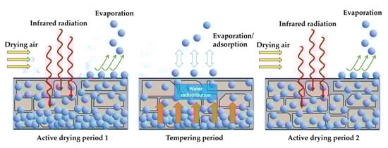 Intermittent drying involves resting periods or tempering between predefined phases of the drying process. As an emerging drying technology, it can realize the control of the drying process by changing the input of drying energy [13]. Intermittent drying is composed of a series of cycles, each of which includes an active drying time and a tempering period in which the material exits the drying environment. It has been proven that throughout the tempering period, moisture diffuses from the inside of the material to the surface, driven by a humidity gradient, resulting in moisture redistribution [14]. The moisture redistribution phenomenon causes the material’s internal moisture to naturally migrate to the surface, improving the drying rate during the following active drying time. The surface of the material has less moisture than its interior, making it easier to remove. [15]. Depending on the humidity difference between the material and the environment at the time of retarding, a small amount of water evaporation or reabsorption phenomenon will also accompany the tempering period [16]. The results of previous studies have shown that the energy consumption in the drying process depends largely on the material processed, parameter settings, drying method, retardation time, and environmental conditions [17,18,19].
