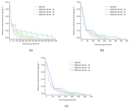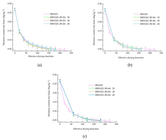 Moisture content profiles of the total drying time at different intermittent ratios. (a) Effective drying time = 20 min; (b) Effective drying time = 40 min; (c) Effective drying time = 60 min.