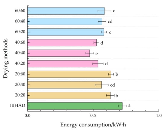 Energy consumption of intermittent drying of jujube slice. Different letters in the figure reveal significant differences (p < 0.05).