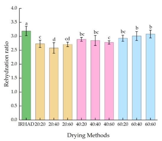 Rehydration rates of jujube slices during intermittent drying. Different letters in the figure reveal significant differences (p < 0.05).