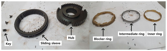 The structure of the synchronizer, as shown in Figure 1, consists of a sleeve, hub, key, and ring; in this study, a double cone type synchronizer is applied [19,20]. Shifting in the synchronizer occurs when a linkage device connected to the synchronizer sleeve moves the shift fork, which then moves the synchronizer to mesh the selected gear with the shaft [21]. When the shift lever is in neutral, the output shaft gear of the main shaft does not mesh with the shaft and revolves freely, causing power interruption and applying drag torque to the shaft due to the viscosity and interference of the synchronizer lubricant.