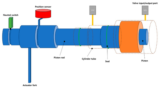 The control system for the synchronizer under study is configured as shown in Figure 2. To prevent simultaneous engagement of the synchronizer, a dual-acting cylinder with mechanical neutrality and an integrated actuator with a position sensor and neutral switch capable of detecting the position of the synchronizer are used for control.