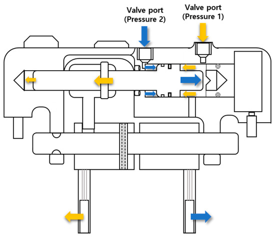 The operating principle of the hydraulic system is designed such that a linkage device connected to the piston rod moves the shift fork according to the direction of the incoming hydraulic pressure. The shift fork moves the synchronizer to help mesh the selected gear with the shaft. As shown in Figure 4, when flow enters the right (indicated by the yellow arrow) valve input/output port, the synchronizer engages the left gear. If the same flow enters both valve input/output ports, mechanical neutrality is maintained due to structural constraints of the ring and cylinder. A proportional pressure relief valve in a hydraulic system operates by maintaining a specific pressure level. When the pressure increases, the valve closes to reduce fluid inflow, and when the pressure decreases, it opens to increase fluid inflow, thereby ensuring system stability. This mechanism is utilized for precise pressure control within the system [25]. Therefore, the key parameters for controlling the synchronizer are the shifting force applied to the hydraulic cylinder of the synchronizer actuator and the pre-shift timing determining when the shift occurs.