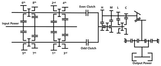 DCT consists of two main shafts and an intermediate shaft connected to the engine. The two main shafts are divided into odd and even numbers, and the final shift is achieved through alternating clutches located at the ends of each shaft to shift to the selected gear ratio. DCT’s ability to shift gears without power interruption is attributed to the use of a preselect method by the synchronizer [10]. This method involves keeping the synchronizer engaged in the next gear on the non-power transmitting shaft while power is being transmitted through the clutch on one shaft. This is based on the assessment of the driving or working state and the user’s intent to shift gears. Therefore, before the driver shifts to the desired gear, the synchronizer for the next gear is already synchronized and waiting, based on the command generated by the gear shift control system.