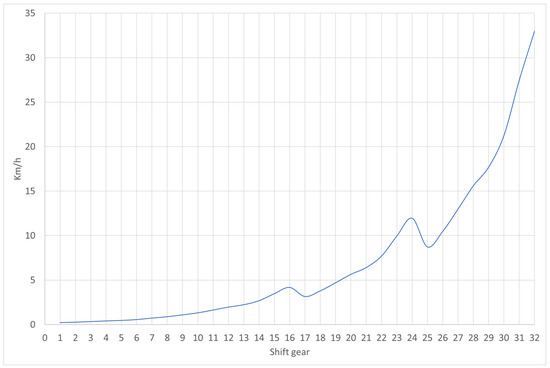 The DCT under study in this research is as shown in Figure 6. The target transmission consists of a main transmission with eight speeds and a sub-transmission with four speeds, resulting in a structure with 32 forward and reverse gears each, as shown in Figure 7, with the speed configuration of each gear shown in Table 3 and Figure 8.