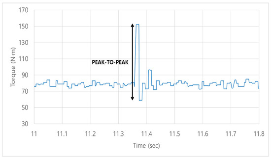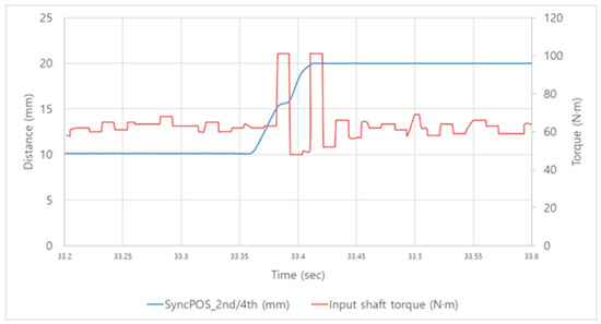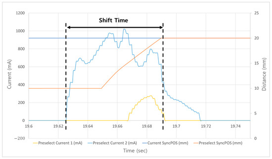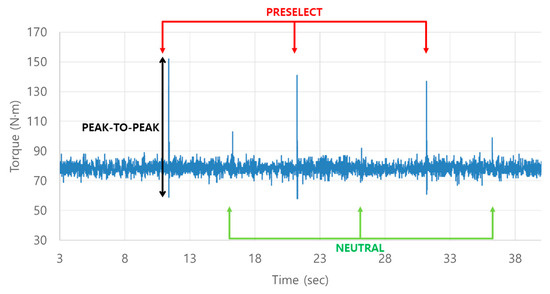 Since the dynamometer bench is not an actual vehicle, it was impossible to measure the shift shock occurring during real driving; therefore, the torque fluctuations on the dynamometer’s input shaft motor caused by synchronizer preselection were considered as the shift shock. In vehicles, shifting involves hydraulic operation of one or more engaging and disengaging components, and the shift shock during shifting is determined by output fluctuations of the engine caused by changes in operating components like the clutch or synchronizer [27]. Therefore, torque fluctuations according to current were represented as the difference between the maximum and minimum points of input shaft torque fluctuation during the synchronizer engagement and disengagement process, shown as peak-to-peak in Figure 9. Shift time was defined as the time from the driver’s shift command to the engagement of the synchronizer gear, as shown in Figure 10. Furthermore, the preselection process was divided into the engagement process (preselect) when the gear is engaged and the disengagement process (neutral) when the engaged gear is disengaged, and tests were conducted accordingly.