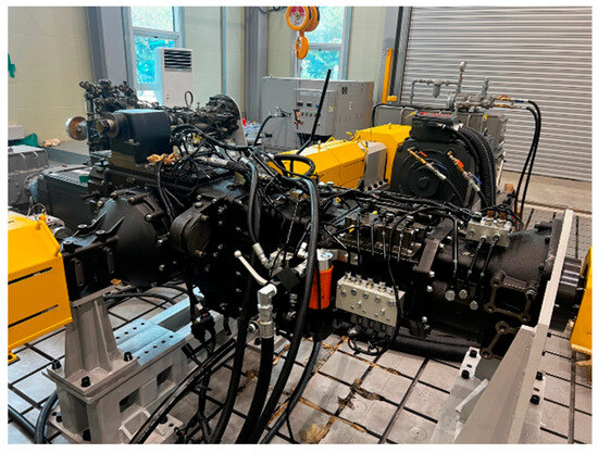 - Park, J.Y.; Hur, J.W.; Jung, G.H.; Lee, K.I.; Kim, K.S. The Modeling and Analysis of the Powertrain in a Automatic Transmission for the Construction Vehicle. In Proceedings of the Spring and Fall Conference of the Korean Society of Automotive Engineers, Yongin-si, Gyeonggi-do, Republic of Korea, 28–29 November 1999; Korean Society of Automotive Engineers: Seoul, Republic of Korea, 1999; pp. 748–754. [Google Scholar]