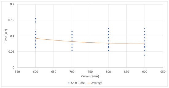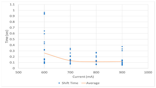 The results showing the change in shift time according to shifting force within the same shift stages are presented in Table 24. In all cases except for 1, 2, and 4, the p-values were higher than the significance level of 0.05, indicating that there is no average difference in shift time according to shifting force. Therefore, changes in shift time according to shifting force were observed only in some shift stages. As shown in Figure 21, a comprehensive analysis of all data showed that as the shifting force increased from 600 mA (0.0919 s) to 700 mA (0.0821 s) to 800 mA (0.077 s) to 900 mA (0.0769 s), there was a tendency for the average shift time to decrease.