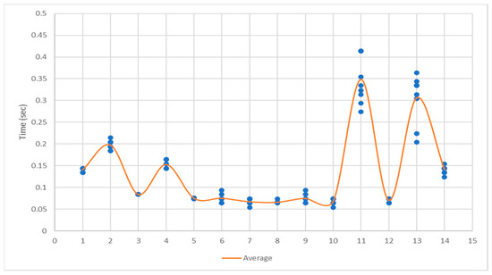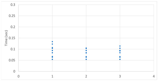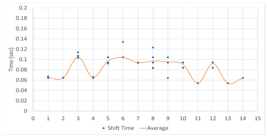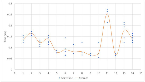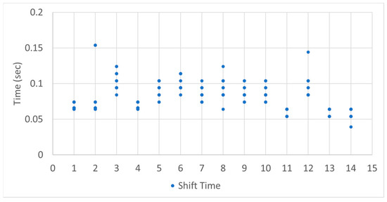 The results for shift time according to shift timing were analyzed as shown in Figure 24. After preselection, the average shift time for neutral immediately following the shift (1) was 0.082 s, during driving at the preselected gear (2) was 0.082 s, and just before shifting from the preselected gear (3) was 0.081 s, showing no significant difference in average shift time according to shift timing. Also, as shown in Figure 25, no correlation was found between shift stages and shift time. Therefore, it was determined that shift timing does not influence shift time.