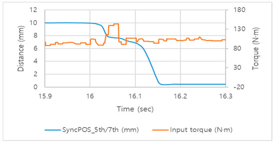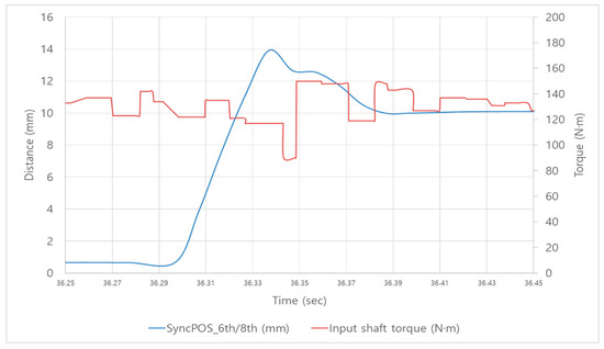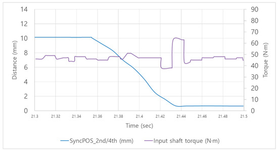 Lastly, the change in input shaft torque peak-to-peak according to the position of the synchronizer sleeve was analyzed as shown in Figure 26 and Table 28. Analysis of the data showed torque peak-to-peak after disengagement in all shifting processes. These fluctuations are likely caused by disengaging the gear in a short time with excessive force, leading to the gear leaving its engagement point, and the subsequent additional position control for reaching the final location causes sudden changes in the synchronizer sleeve’s position, resulting in inertia changes that cause shift shock.
