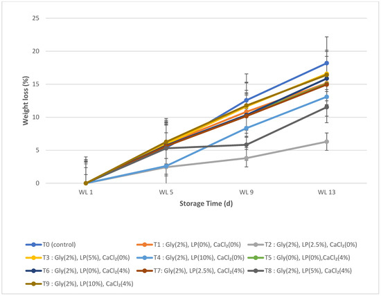 Figure 1. Influence of different edible coating formulations on the weight loss of the banana fruits during storage at 19–22 °C and 40–60% relative humidity. Where WL 1, WL 5, WL 9 and WL 13 represent the weight loss value on day 1, 5, 9 and 13. Each data point consisted of 10 fruits repeated three times.