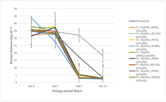 Figure 2. Influence of different edible coating formulations on the firmness of the banana fruits during storage at 19–22 °C and 40–60% relative humidity. Each data point consisted of 3 fruits repeated three times and on each fruit, 3 values were obtained respectively from the middle and both ends of the fruits; the vertical bar represents the standard errors of their means.