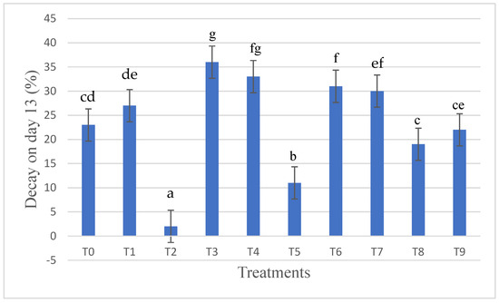 Figure 3. Decay percentage of coated and uncoated bananas on day 20, where T0 = control sample with only distilled water, T1 = distilled water + glycerol (2%), T2 = glycerol (2%) + 2.5% lemon peel powder, T3 = glycerol (2%) and 5% lemon peel powder, T4 = glycerol (2%) + 10% lemon peel powder, T5 = 4% calcium chloride (CaCl2), T6 = glycerol (2%) + CaCl2 (4%), T7 = glycerol (2%), CaCl2 (4%) and 2.5% lemon peel powder, T8 = glycerol (2%), CaCl2 (4%) and 5% lemon peel powder, and T9 = glycerol (2%), CaCl2 (4%), and 10% lemon peel powder.