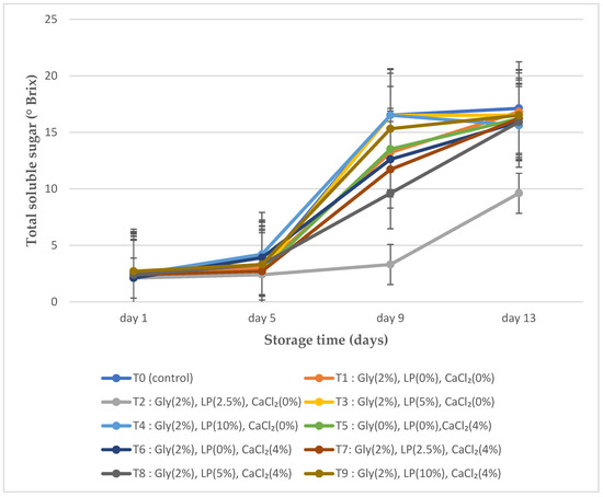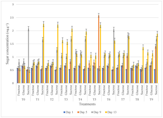 Figure 7. The concentration of sugars in coated and non-coated bananas during the storage period at 19–22 °C and 40–60% relative humidity, where T0 = control sample with only distilled water, T1 = distilled water + glycerol (2%), T2 = glycerol (2%) + 2.5% lemon peel powder, T3 = glycerol (2%) and 5% lemon peel powder, T4 = glycerol (2%) + 10% lemon peel powder, T5 = 4% calcium chloride (CaCl2), T6 = glycerol (2%) + CaCl2 (4%), T7 = glycerol (2%), CaCl2 (4%) and 2.5% lemon peel powder, T8 = glycerol (2%), CaCl2 (4%) and 5% lemon peel powder, and T9 = glycerol (2%), CaCl2 (4%), and 10% lemon peel powder. Each data point was a pooled sample of fresh material from 3 fruits repeated thrice and the vertical bar represents the standard errors of their means.