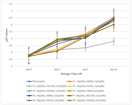 Figure 5. Influence of different edible coating formulations on the pH of the banana fruits during storage at 19–22 °C and 40–60% relative humidity. Each data point was a pooled sample of fresh material from 3 fruits repeated thrice and the vertical bar represents the standard errors of their means.