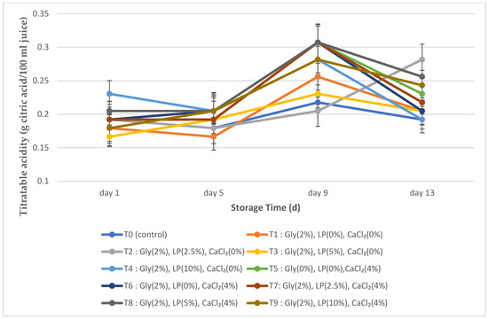 Figure 6. Influence of different edible coating formulations on the titratable acidity of the banana fruits during storage at 19–22 °C and 40–60% relative humidity. Storage conditions T0–T9 are described in detail in the Materials and Methods section (experimental design). Each data point was a pooled sample of fresh material from 3 fruits repeated thrice and the vertical bar represents the standard errors of their means.