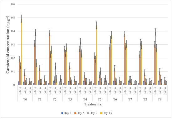 Figure 8. Concentration of carotenoids in coated and non-coated bananas during the storage period at 19–22 °C and 40–60% relative humidity, where T0 = control sample with only distilled water, T1 = distilled water + glycerol (2%), T2 = glycerol (2%) + 2.5% lemon peel powder, T3 = glycerol (2%) and 5% lemon peel powder, T4 = glycerol (2%) + 10% lemon peel powder, T5 = 4% calcium chloride (CaCl2), T6 = glycerol (2%) + CaCl2 (4%), T7 = glycerol (2%), CaCl2 (4%) and 2.5% lemon peel powder, T8 = glycerol (2%), CaCl2 (4%) and 5% lemon peel powder, and T9 = glycerol (2%), CaCl2 (4%), and 10% lemon peel powder. Each data point was a pooled sample of fresh material from 3 fruits repeated thrice and the vertical bar represents the standard errors of their means.