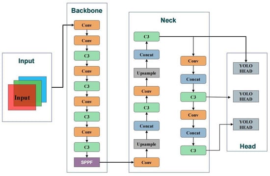 The YOLO (You Only Look Once) series, represented by Redmon’s pioneering work, has revolutionized object detection via its fast and accurate performance. Starting with YOLOv1, the framework quickly evolved with YOLOv2 (YOLO9000) and YOLOv3, continually advancing the state of the art by simplifying object detection into a single regression task. This shift significantly reduced the complexity of object detection, previously characterized by separate stages of the region’s proposal and classification. With YOLOv4, the series introduced even more efficient mechanisms such as weighted residual connections and cross-stage partial connections, improving both speed and accuracy. However, it is YOLOv5 that has become particularly prominent for its deployment readiness and suitability for real-time applications. YOLOv5’s architecture, featuring automatic optimization and scalable layers, is adept at handling a variety of real-world detection scenarios efficiently. While later iterations such as YOLOv7 and YOLOv8 have continued to refine the model’s capabilities, YOLOv5 remains a preferred choice for its balance between speed and performance, especially in real-time applications. YOLOv5 stands out in the YOLO series for its deployment capabilities in real-time applications. Its architecture is designed for ease of use with automatic optimization and scalability, efficiently handling a variety of real-world detection scenarios [18]. Notably, its convenient deployability has facilitated its rapid integration into detection tasks, especially on resource-constrained platforms. Although subsequent versions such as YOLOv7 and YOLOv8 offer further refined architectures, YOLOv5 remains the preferred choice due to the admirable balance it strikes between speed and performance. This has allowed it to excel in various applications, notably in the agricultural sector. For agricultural practices, especially in pest detection, YOLOv5 has emerged as the technology of choice [19]. Its structure and algorithmic design, as illustrated in Figure 3, provide a solid foundation for real-time detection and high precision. An in-depth overview of the YOLOv5 architecture follows.
