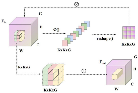 In this context, signifies the result post-involution operation. The convolution kernel, dynamically formed from the input feature map, is represented by K. The i-th channel or segment of the input feature map F is denoted by , while the ∗ operation corresponds to the convolution process. For each channel of the input feature map, the Involution mechanism generates a corresponding kernel. This dynamic kernel generation is further detailed as: