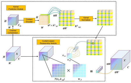 Content-Aware ReAssembly of FEatures (CARAFE) is a unique upsampling technique in neural networks that introduces content awareness by adaptively predicting the upsampling kernel based on the feature map’s content. Diverging from conventional methods, this mechanism brings to the fore two primary components: the Kernel Prediction Module and the Content-Aware Reassembly Module [23]. As illustrated in Figure 7, CARAFE not only boasts an expansive receptive field, but also astutely leverages input features for reassembly, ensuring a harmonious and efficient upsampling process.