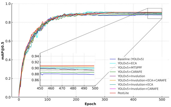 To provide a clearer insight into how different modules affect model performance, we graphically represented the results of our ablation studies. In this graph, the x-axis denotes the training epochs, while the y-axis signifies the mAP (Mean Average Precision). As depicted in Figure 11, we used mAP as the metric to assess the effectiveness of the various modules integrated into the algorithm. This visualization clearly demonstrates the enhancements each module brings to PestLite, which significantly surpasses the baseline algorithm in terms of mAP.