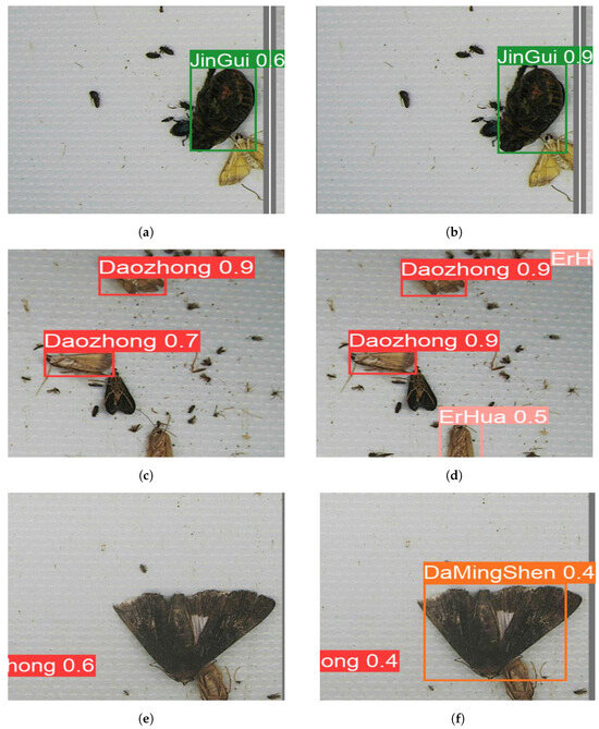 As shown in Figure 12, in the first set of images, we observe that under such conditions, the YOLOv5 image displays certain limitations in pest detection. In contrast, the PestLite image clearly offers enhanced detection. The recognition rate for the pest labeled as “JinGui” improved from 0.6 to 0.9, surpassing the accuracy of the original YOLOv5 algorithm. Transitioning to the second set of images, where multiple pests are present in a single frame, the PestLite image distinctly showcases superior multi-object detection capabilities. It effectively identifies and differentiates the types of pests encountered in the image. In contrast, YOLOv5 missed the pest labeled as “ErHua”, while PestLite successfully detected it and improved the accuracy of the pest labeled “DaoZhong” from 0.7 to 0.9. In the remaining sets of photos, YOLOv5 showed varying degrees of misses, whereas PestLite consistently excelled, successfully detecting pests labeled as “DaMingShen” and “HeiBai”. While YOLOv5 might miss certain pests, PestLite can accurately identify them. This enhanced performance can be attributed to PestLite’s integration of Involution, MTSPPF, CARAFE, and ECA, leading to improved capabilities in handling such pest detections.