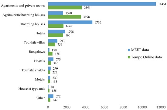 In our analysis of the touristic offer of Romania, we identified some disparities between the data provided by the Ministry of Economy, Entrepreneurship, and Tourism (MEET) and those presented in the Tempo Online database (Figure 1) [,]. According to the methodology of the Tempo Database, tourist accommodation structures with capacities of less than 5 places are not included in the statistical research []. This explains the major differences between the two data sources regarding apartments and private rooms, which are characterized by low capacities. Touristic chalets, villas, and hotels also show differences, but they are not as pronounced as in some other categories.