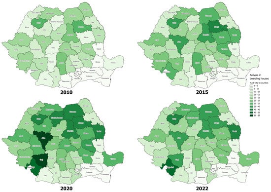 Major changes to the spatial distribution of Romanian tourism occurred between the year 2010 and 2022 (Figure 3). In most counties, the overall share of touristic arrivals to agritourism and conventional boarding houses rose sharply, in some counties reaching more than 50% of all touristic arrivals. Factors contributing to this shift include changing consumer preferences, a desire for more sustainable and nature-oriented tourism, and targeted efforts by local authorities and businesses to promote these types of accommodations []. The consumer trends emphasize a desire to escape to rural tranquility and experience local cuisine and traditional practices. Guests often stay in farmhouses, participating in workshops on traditional crafts and engaging in activities like grape harvesting or other types of activities []. This form of tourism also aligns with sustainable principles, promoting responsible travel and supporting local communities, thereby preserving the authenticity of rural life.