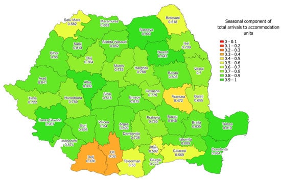 Distribution of seasonal component for overall arrivals to accommodation units, per county.
