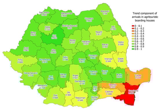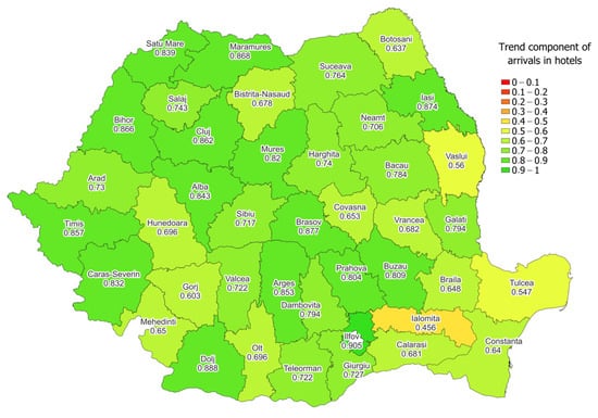 By examining the trend component of overall arrivals by counties, a common pattern emerges, revealing that the vast majority of the counties exhibit remarkably elevated levels of this key indicator. Among them, Maramureș and Ilfov stand out, boasting an exceptionally elevated level of trend, which suggests that during the last 13 years, it was marked by impressive growth (Figure 5).