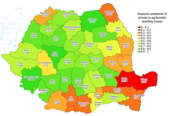 As such, based on our research, we see that a cluster of high growth and conversely, high seasonality in agritourism is located in Central Romania. Low-high outliers are the Sălaj and the Hunedoara counties, which have comparatively low trend and seasonality values compared to neighboring counties. In the case of Sălaj County, a more engaged approach toward promoting agritourism can be beneficial, both for local authorities and businesses. Previous research notes the touristic potential of this region [,]. On the other hand, Hunedoara County seems to be less prone to seasonal variations than its neighbors, while maintaining high trend values. This indicates that in addition to the factors previously mentioned in the research literature, seasonality can also be alleviated through the usage of touristic potential. Again, further studies are required to confirm and explore this.