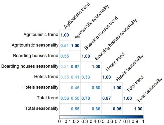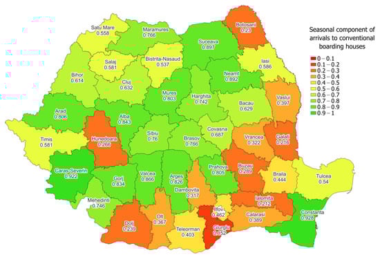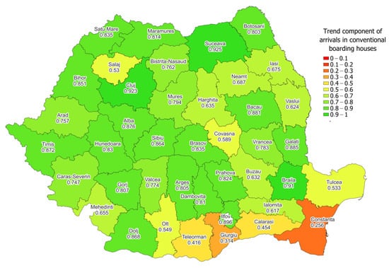 The trend and seasonality strength were calculated for boarding houses (including agritouristic and conventional), hotels, and total arrivals, per county. The rest of the accommodation unit types returned inconclusive and unreliable results, as the quality of the available data per month and county was less than ideal. However, several insights can be gained from this approach, as described below: