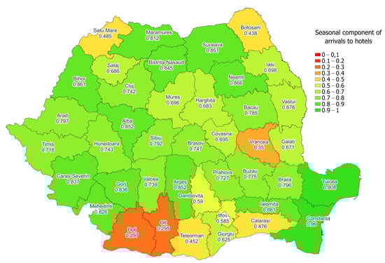 Seasonal strength values range from 0.32 to 0.98, with Constanta exhibiting the highest seasonal strength (0.98), emphasizing the significant impact of seasonality on tourism in this county. Dolj, Olt, and Teleorman, on the other hand, have notably lower seasonal strengths, leading to less reliance on seasonal fluctuations (Figure 6).