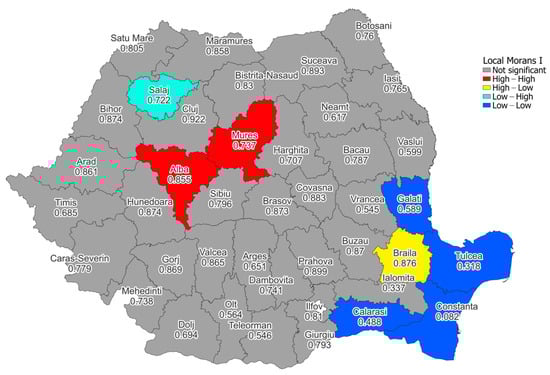 The high-low outliers are Brăila and Călărași for trend and seasonality, respectively. Brăila seems to exhibit higher trend values than its neighbors regarding seasonality, while Călărași has higher seasonality than neighboring counties. A diversification of the tourist offers on the seaside and in the Danube Delta might be advantageous for those counties.