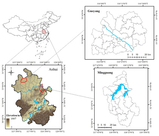 Anhui Province is situated in the eastern part of China, spanning a geographical scope of 29°41′~34°38′ N and 114°54′~119°37′ E. It covers a land area of 140,100 km2 and is characterized by the presence of two major river systems, i.e., the Yangtze River and the Huaihe River. The province exhibits several distinct landforms, comprising the northern plain, the hills situated between the Yangtze River and the Huaihe River, the plain along the Yangtze River, and the western and southern mountainous areas, with significant differences in natural conditions. Anhui spans the north and south China in geographical sense, the region north of the Huaihe River is characterized by a warm temperate semi-humid monsoon climate, while the region south of the Huaihe River has a subtropical humid monsoon climate. Anhui Province is an important national production base for grain and oil crops, with soybean cultivation consistently ranking among the top three in the country. Soybean is mainly grown in the northern plain, which has a low-lying terrain and mainly cultivates dryland crops. The Jianghuai hilly region, characterized by hilly and rough terrain with a highly fragmented land surface, is dominated by rice cultivation. In this study, two county-level administrative units, i.e., Guoyang in the northern plain and Mingguang in the Jianghuai hilly region were selected as the study areas. These regions have diverse crop types, with the common practice of mixed cropping of different crops, leading to fragmented farmland landscapes.