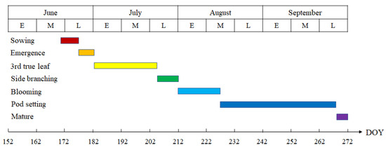 The soybean in Guoyang is usually sown in mid to late June, begins podding in mid-August, and undergoes harvesting from late September to early October (China Meteorological Data Service Centre, http://data.cma.cn/, accessed on 22 February 2019), the major phenological stages are illustrated in Figure 2. It is noteworthy that Mingguang lacks a dedicated crop growth and development observation station, and the data observed at the nearby Chuzhou station does not include information specific to soybean crop. After consulting with the Mingguang Agricultural Technology Extension Center, we learn that soybean in the local area is generally sown in mid-June, enters pod-setting stage in early August, and is harvested in late September, the growing season is relatively shorter compared to Guoyang.