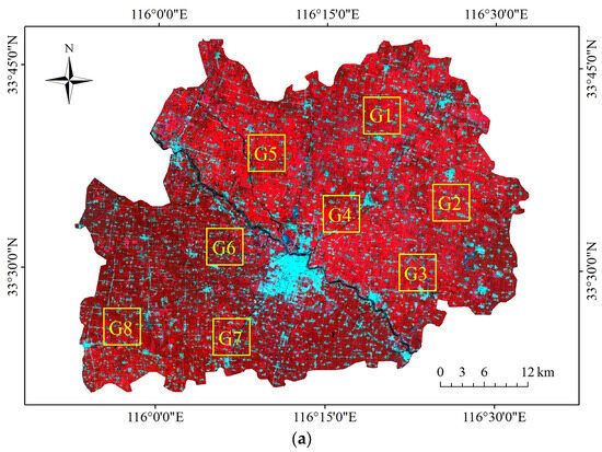 The acquired WFV image is in L1A level and requires preprocessing such as orthorectification, radiometric calibration, atmospheric correction, and clipping. In this study, the ENVI 5.3 software was used to perform these operations. For orthorectification, NASA-DEM data with a spatial resolution of 30 m available from the LP-DAAC Data Pool (https://lpdaac.usgs.gov/products/nasadem_hgtv001/, accessed on 22 February 2019) was applied and the individual tiles needed to be mosaiced together in advance with the support of ArcGIS 10.7. Radiometric calibration coefficients for the GF-6 WFV sensor in 2019 was obtained from the China Centre for Resources Satellite Data and Application (https://www.cresda.com/zgzywxyyzx/zlxz/list/zlxz_1.html, accessed on 22 February 2019), and atmospheric correction was conducted employing the FLAASH module. Finally, the image was subset using the administrative boundary of Guoyang and Mingguang to obtain the data within these study areas. It was worth noting that even after orthorectification, there still was a certain geolocation bias in the WFV image. In our research, a spatial registration was performed adopting two scenes of Landsat 8-OLI image to correct the geolocation deviation, with the results of image sharpening (15-m spatial resolution, NNDiffuse method) involving panchromatic and multispectral bands serving as reference data. The reference OLI image for Guoyang was acquired on 27 September 2019 (Path/Row: 122/037), and that for Mingguang was acquired on 19 August (Path/Row: 121/037).