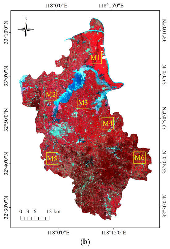 Spatial distribution of the labeled ground samples established in the two study areas. Note that the text in yellow indicates the number for each ground sample, where ‘G’ represents the Guoyang study area, and ‘M’ represents the Mingguang study area; the base maps are GF-6 WFV data acquired on 16 August 2019 in false-color (R(4): G(3): B(2)) composites. (a) Guoyang. (b) Mingguang.